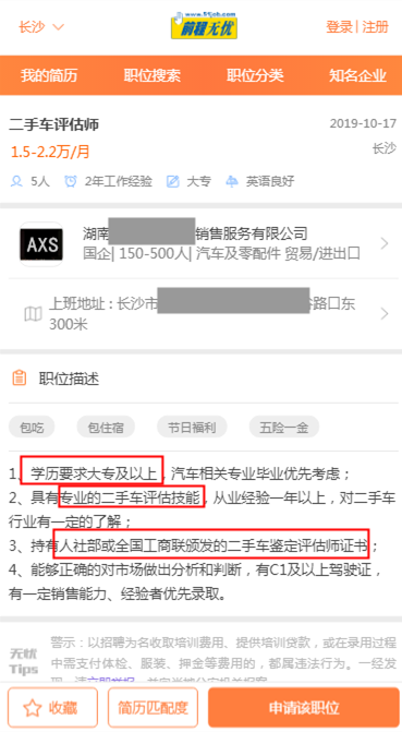 從招(zhao)聘(pin)信息來(lai)(lai)看,這(zhe)家公(gong)司(si)給二手車評估(gu)師開出的月薪為1.5-2.2萬元,算是業(ye)內(nei)一個比較(jiao)平(ping)均的工資水平(ping);接下來(lai)(lai)咱們再來(lai)(lai)看看它(ta)的招(zhao)聘(pin)要求,你就會(hui)明白它(ta)的工資為什么會(hui)這(zhe)么高!