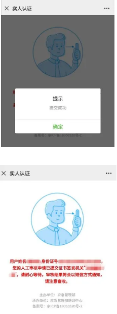 10.提示“提交成功”后,點擊“確定”。頁面顯示“您的人工審核申請已提交證書簽發機關,審核結果將會以短信方式通知,請注意查收。”