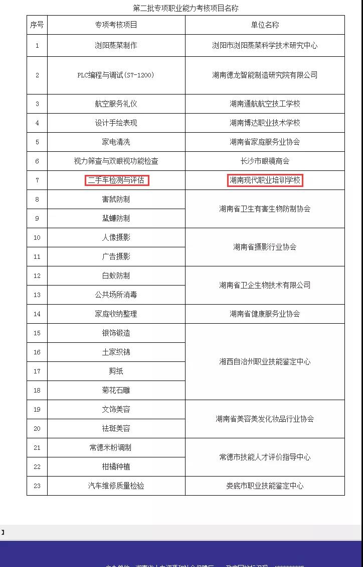 通知:湖南現代職業培訓學校獲批二手車檢測與評估專項職業能力考核
