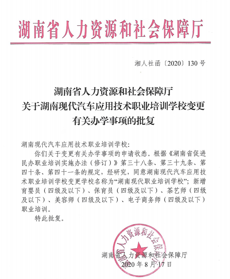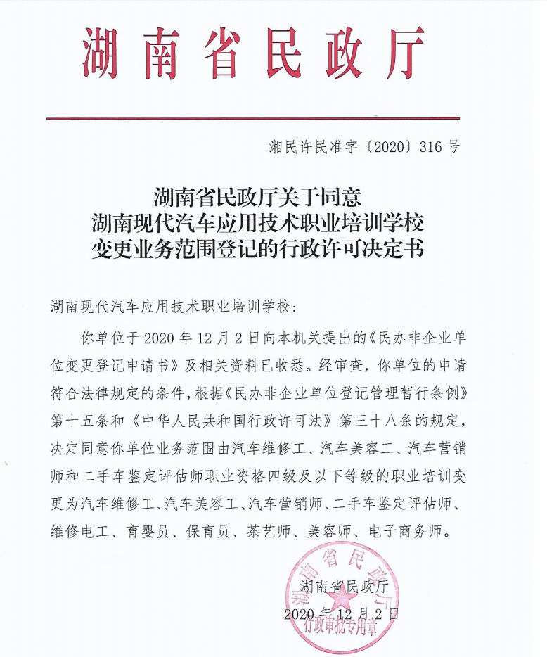 湖南現代汽車應用技術職業培訓學校于12月2日正式提出更名申請,12月11日通過湖南省人力資源和社會保障廳批復更名為湖南現代職業培訓學校,學校在原二手車鑒定評估師、汽車營銷師、汽車維修工、電工培訓工種的基礎上,新增了育嬰員、保育員、茶藝師、美容師、電子商務師等職業工種,并獲批“二手車檢測與評估”專項能力考核項目,同時在湖南省民政廳備案。