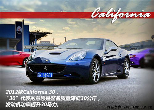 我們對于California并不陌生,早在2009年汽車之家就對09款車型做了詳盡的體驗(點擊查看)。今天試駕的是最新2012款California30,“30”代表的意思是整備質量降低30公斤,發動機功率提升30馬力。