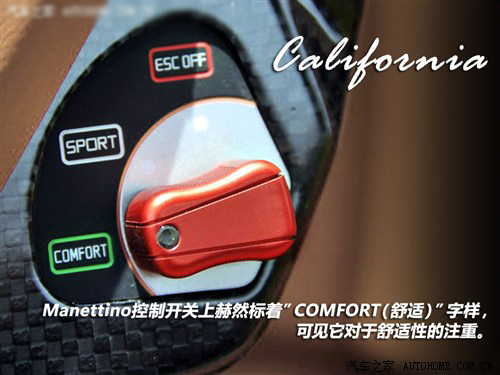 位于方向盤右下方的Manettino控制開關很能說明問題。各位應該對我們曾經試駕過的法拉利458 Italia印象深刻(點擊查看試駕文章),那輛車最普通的駕駛模式是“SPORT(運動)”,方向盤左邊有個避震器標志的按鈕,理論上說按下去后懸掛會變“軟”,官方解釋說其實那是為了“增強懸掛的濾波能力,以便于在像紐博格林北環這樣崎嶇的賽道中增強操控性...”——純粹的性能機器!再看看California30,駕駛模式上赫然印著“Comfort(舒適)”字樣,毫無疑問,這就是差別。