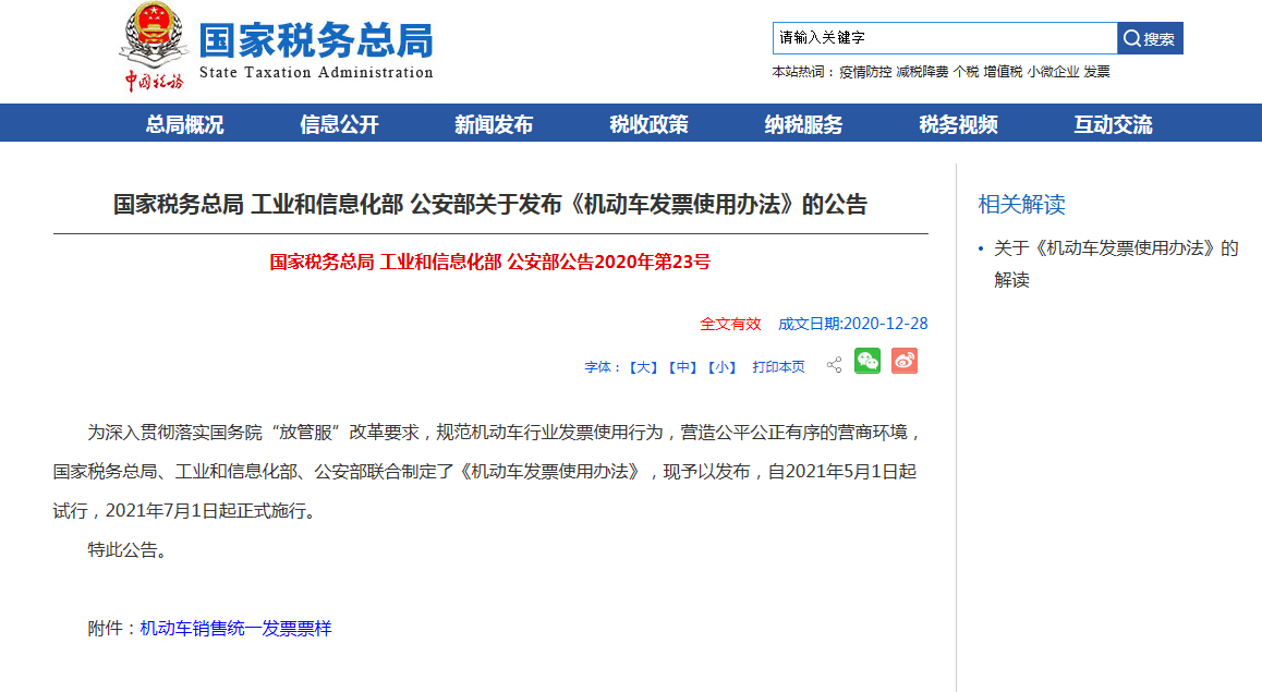 為深入(ru)貫徹落實國務(wu)院“放管服”改革要(yao)求,規范機動車(che)行業(ye)(ye)發票使(shi)用(yong)行為,營(ying)造公平公正(zheng)有(you)序的營(ying)商環境(jing),國家稅務(wu)總局(ju)、工業(ye)(ye)和信息化部、公安部聯合制(zhi)定(ding)了《機動車(che)發票使(shi)用(yong)辦法》,現予以發布(bu),自2021年5月1日起試行,2021年7月1日起正(zheng)式施行。
