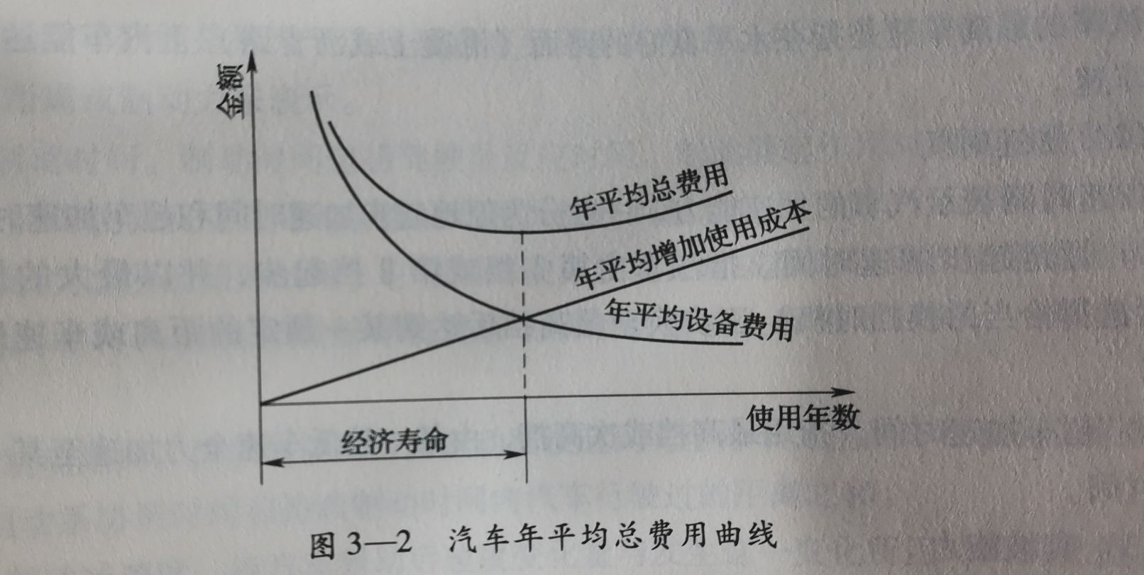 年平均費用是車輛在使用年限內,年平均折舊費用與該汽車發生的經營費用之和。汽車使用時間越長,每年分攤的折舊費越少;但隨著使用年限的增加,汽車有形磨損增加,汽車技術性能逐漸下降,使汽車的運行材料(主要是燃料和潤滑料)費用、工時費用、維修費用增加。延長使用年限使折舊費用的下降,有時會被經營費用的增加逐漸抵消。年平均總費用是隨使用時間而變化的函數。汽車使用至一定年限會出現年限平均總費用的最低值,如圖3-2所示。決定年平均總費用最低的橫坐標值,就是汽車的經濟壽命,即
