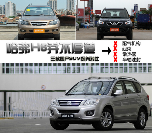 【中華汽車網校 車訊】三款國產的SUV當中,哈弗H6的銷量可謂是高得驚人,不過從零件質保期和易損件質保期來看卻有點不厚道了。隨著自主品牌SUV越來越得到認可,很多愛國的朋友總想在主流的國產SUV身上尋找一款入門價格低,保養費用低并且保養保障多的車型。而在通常的保養信息中,我們一般只關注諸如整車質保期等信息,對于更為深入和具體的信息,例如具體到某一零件的保修政策,我們大都不太清楚。本期我們就選擇長城H6、比亞迪S6和奇瑞瑞虎,深入對比他們在保養政策細節方面的信息。