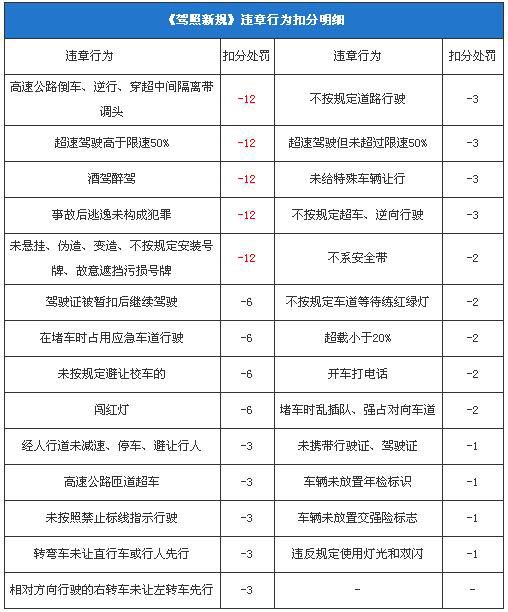 《駕照(zhao)新規》中的違章扣分明(ming)細(xi)表(biao)格整理: