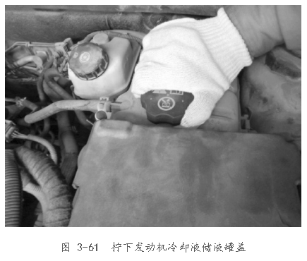 ①將汽車熄火,使冷卻液溫度降低,打開冷卻液儲液罐蓋,如圖3-61所示。如果想在發動機仍然發熱時擰下,則應在蓋.上放一塊布并且松開45°,慢慢釋放壓力,然后再擰下冷卻液儲液罐蓋。不要立即擰下冷卻液儲液罐蓋,否則冷卻液將會濺出傷人。