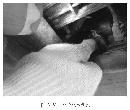 ③擰松放水開關,如圖3-62所示。排放冷卻液,用容器收集冷卻液。若該車型無放水開關,則拆下下水管夾箍,拉出冷卻液軟管,排放冷卻液。檢查排出的發動機冷卻液中有無銹蝕、腐蝕或變色。如果受污染,應先沖洗發動機冷卻系統。