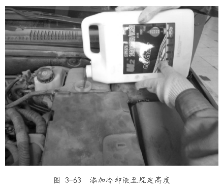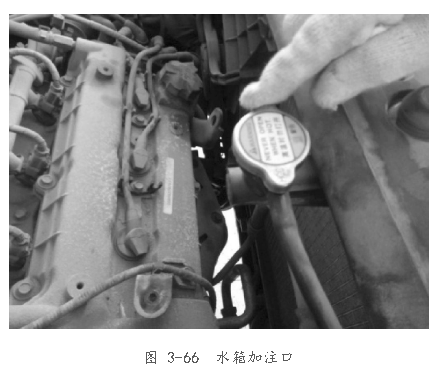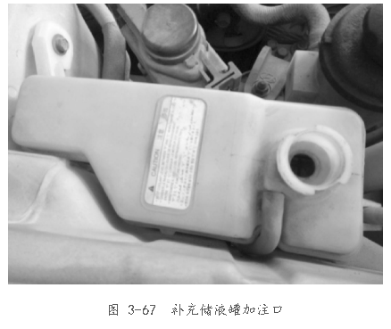⑦以上是無補充水罐的冷卻液加注。對于有冷卻液補充水罐的要先加滿水箱,再加滿補充水罐液面至規定位置,如圖3-66和圖3-67所示。