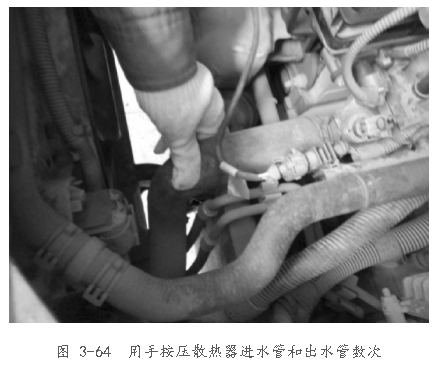 ②用手按壓散熱器進水管和出水管數次,如圖3-64所示,檢查冷卻液液位,若液面下降則及時添加冷卻液至高位。