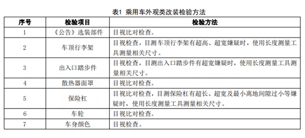 6 檢驗方法 乘用車外觀類改裝檢驗方法見表1。