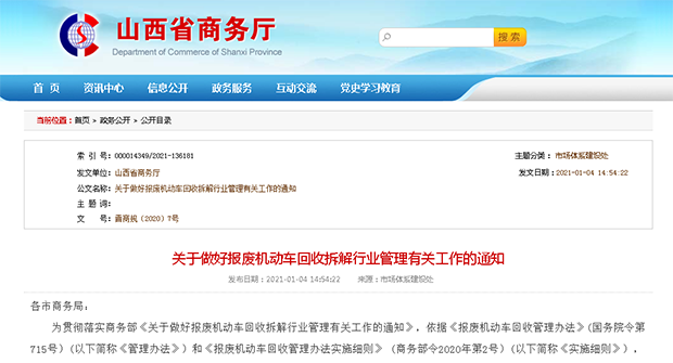 山西省報廢機動車回收拆解行業管理有關工作的通知