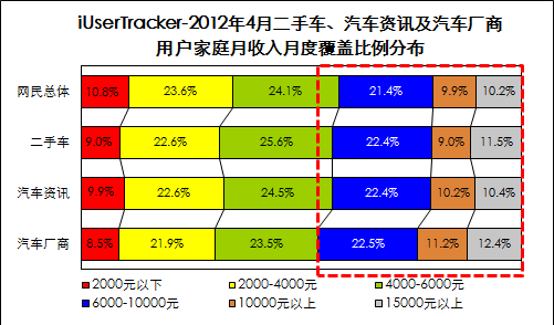 用戶屬性數據顯示,與網民總體相比,通過網絡關注汽車信息的網民月收入相對較高。二手車和汽車資訊的訪問者收入分布大體相仿,家庭月收入在6000元以上的用戶占比都在4成以上。而汽車廠商中的高收入用戶占比相對更多,家庭月收入在6000元以上的用戶達46%。可見,汽車資訊中有較多的愛好者,而汽車廠商訪問者中涵蓋更多有消費能力及品牌意識的網民。