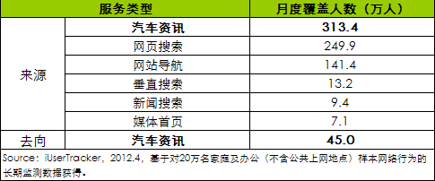 從訪問來源來看,汽車資訊服務是二手車網站訪問的最主要來源,占4月二手車覆蓋人數的16.5%,其它主要來源還包括有搜索及網站導航等。這顯示出現階段中國網絡二手車市場與汽車資訊網站間的密切關聯。目前大型二手車網站多為成熟汽車網站二手車頻道的獨立域名,與原汽車網站間仍保留了較為密切的鏈接跳轉關系。這也從另一個側面反映出目前用戶主動上網獲取二手車信息的意識較弱。