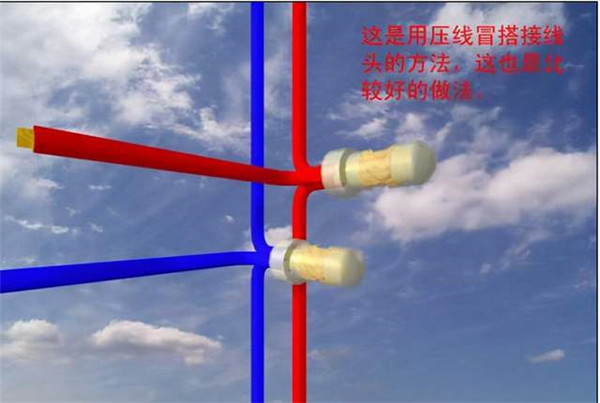 3.第三種接法,就是壓線冒接線法,這種方法是最規范和最實用的,但是它需要專用工具來做,壓線冒的壓線鉗來壓線,把壓電線用的專用鉗子,套在壓線冒上,用力壓緊就行了。壓線冒的大小根據所壓線徑的大小與根數有關常用的是T4型的,就是直徑毫米的,能壓四根四平方毫米的電線。