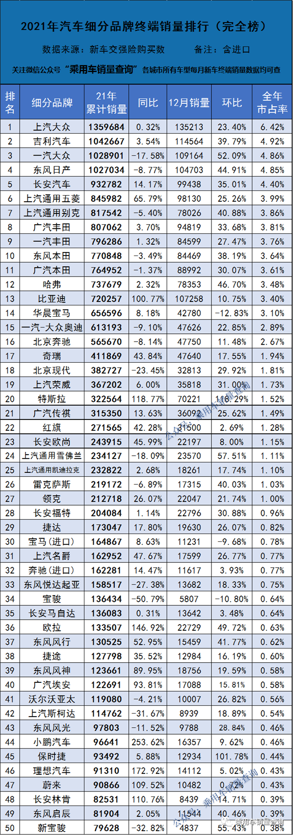 2021年全年汽車終端零售銷量細分品牌排行出爐:排名前十名的細分品牌依次為:上汽大眾、吉利汽車、一汽大眾、東風日產、長安汽車、上汽通用五菱、上汽通用別克、廣汽豐田、一汽豐田、東風本田;前十名總計銷售942.9萬臺,占比44.5%。