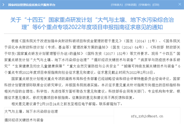 科學技(ji)術部關于(yu)“十(shi)四五(wu)”國(guo)家重點(dian)研發(fa)計劃“大氣與土壤、地下水污染綜合治理”等6個重點(dian)專項2022年度項目(mu)申(shen)報指南征求意見(jian)的通知