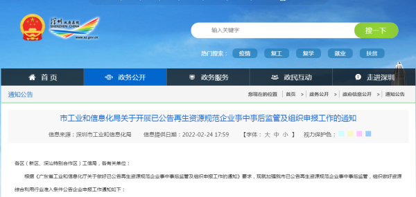 深圳市工業和信息化局關于開展已公告再生資源規范企業事中事后監管及組織申報工作的通知