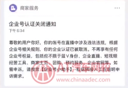 也有部分二手車商收到了官方發來的通知:“尊敬的用戶你好,你的帳號在直播中涉及違法違規,根據企業號相關規則,你的企業認證已被取消。不再享有任何企業號校益,包括但不限于藍V身份,企業直播、短視題經營工具,商家主頁、團購、預約服務、企業官網等。如需申訴,請搜索[企業號小助手] -私信轉接人工后說明申訴需求。”