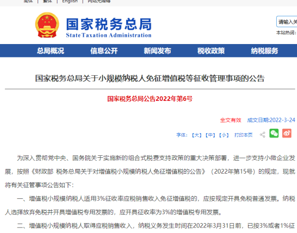 國家稅務總局關于小規模納稅人免征增值稅等征收管理事項的公告