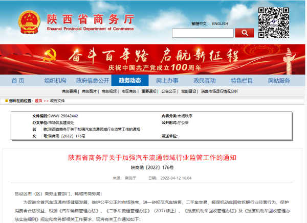 陜西省商務廳關于做好報廢機動車回收拆解企業資質認定及行業管理有關工作的通知