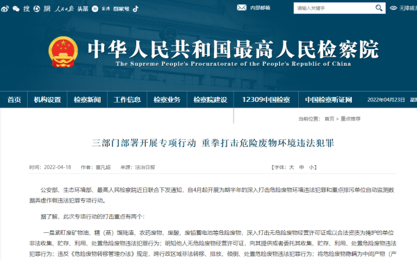 公安部、生態環境部、最高人民檢察院近日聯合下發通知,自4月起開展為期半年的深入打擊危險廢物環境違法犯罪和重點排污單位自動監測數據弄虛作假違法犯罪專項行動。