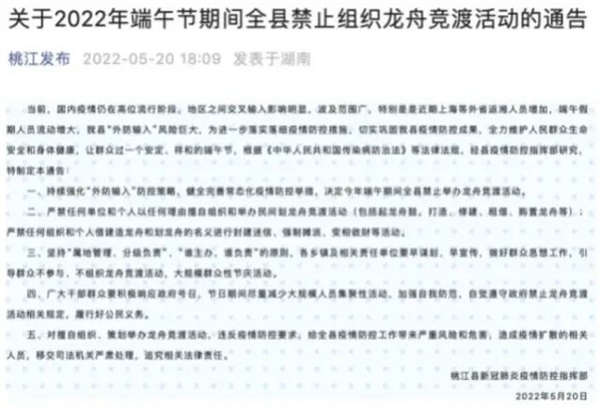 5月20日,湖南省益陽市桃江縣新冠肺炎疫情防控指揮部發布了《關于2022年端午節期間全縣禁止組織龍舟競渡活動的通告》,通告中提到:持續強化“外防輸入”防控策略,健全完善常態化疫情防控舉措,決定今年端午期間全縣禁止舉辦龍舟競渡活動。