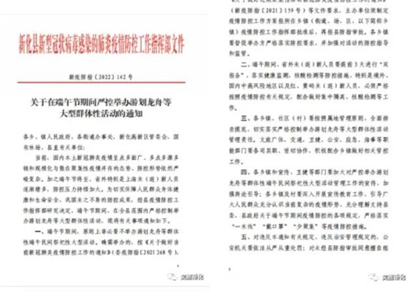 湖南婁底新化縣疫情防控指揮部也在5月26日發布《關于在端午節期間嚴控舉辦游劃龍舟等 大型群體性活動的通知》,要求端午節期間,原則上非必要不舉辦游劃龍舟等群體性端午民間祭祀性大型活動。