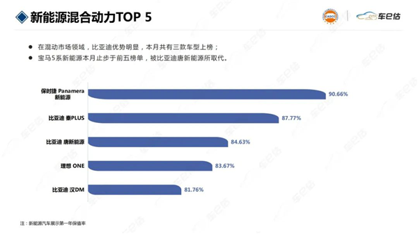 要說在混動領域建樹頗豐的汽車品牌是誰,比亞迪無疑是繞不開的品牌之一。即使在整體市場低迷的大環境下,比亞迪的混動車型仍熱賣。在本月前五榜單中,比亞迪共有三款車型上榜:秦PLUS、唐新能源、漢DM,分別位于榜單第二、第三、第五,保值率依次為87.77%、84.63%及81.76%。其余上榜的還有保時捷Panamera新能源及理想ONE,兩者保值率高達90.66%、83.67%。從整體數據來看,前五品牌的保值率均在81%以上。