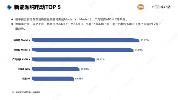 新能源純電動汽車的保值率低一直是消費者擔憂的“痛點”。不過,今年新能源汽車不斷漲價,提車周期變長,因此在二手車市場也變得炙手可熱,保值率也有所提升。比如本月依舊位居榜單前三的特斯拉Model Y、Model 3、廣汽埃安AION Y,三者的保值率分別高達95.77%、94.80%、88.47%。至于排名第四的比亞迪漢EV算是純電動車保值率榜單的“常客”,本月保值率為85.89%。小鵬P7延續上月優勢,本月依然在這一領域的“比拼”中保有一席之地,不過排名從上月第四下滑至第五,保值率為84.98%。