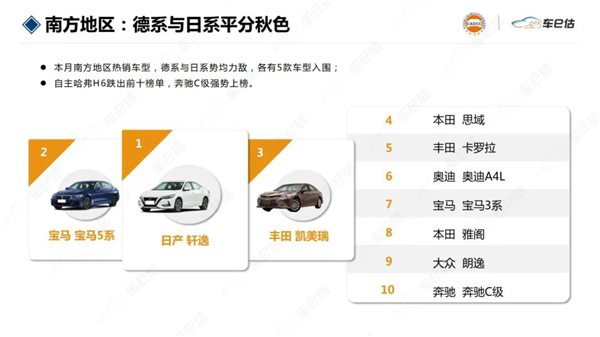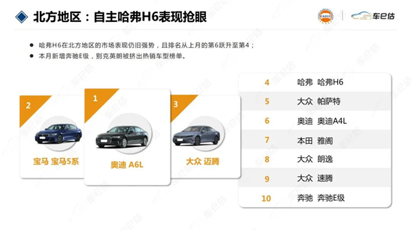 北方地區熱銷車型前三與上月完全一致,其中,銷量冠、亞軍均是豪華品牌中大型轎車:奧迪A6L、寶馬5系,這兩款車型在國內認知度高,銷量規模大,且寶馬5系是唯一一款單月零售銷量過萬臺的車型。此外,寶馬5系還是南方地區銷量亞軍!榜單的第三名是大眾邁騰。不得不說,哈弗H6的表現讓人眼前一亮,不僅連續數月上榜,且本月的排名躍升至第四。同樣在排名上有所上升的是大眾帕薩特,從上月的第八升至第五。再來看榜單的其他幾款車型,奧迪A4L、大眾朗逸、大眾速騰、奔馳E級,以上車型可以說是該榜單的“常駐嘉賓”。其中,奔馳E級強勢擠掉別克英朗,成為北方地區熱銷車型之一。值得注意的是,本田雅閣是唯一上榜的日系車型,排名第七。