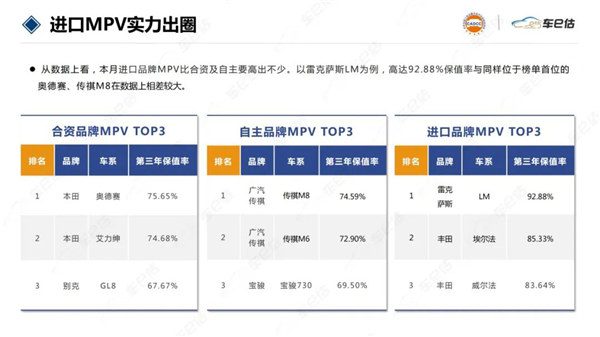 說起MPV,國內不少消費者腦海中首先浮現的通常是別克、豐田、本田等合資品牌,比如奧德賽、艾力紳、GL8等MPV車型。本田的奧德賽一直都是家用MPV市場的標桿車型,與艾力紳組合搭檔,一個主攻家用一個主攻商用,兄弟倆合力與來自上汽通用的別克GL8在MPV車型保值率排行中競爭多年。環比上月,三者的保值率浮動不大,分別為75.65%、74.68%、67.67%。