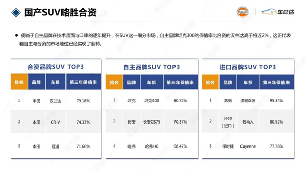 本月上榜的進口SUV品牌與上月稍有不同,雷克薩斯RX被擠出前三的位置。榜單新增奔馳G級,且以95.34%高保值率拿下第一名。至于排在后面的Jeep牧馬人及保時捷Cayenne則落后于奔馳G級,兩者保值率達80.52%、77.78%。從保值率來看,進口車比較保值不無道理。