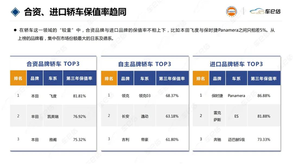 合資品牌轎車前三與上月排名一致,上榜的品牌依舊是市場熱度高、銷量可觀、口碑極佳的飛度、凱美瑞及雅閣。保值率方面,三者的數據較之上月基本持平,分別為81.81%、76.92%、75.32%。
