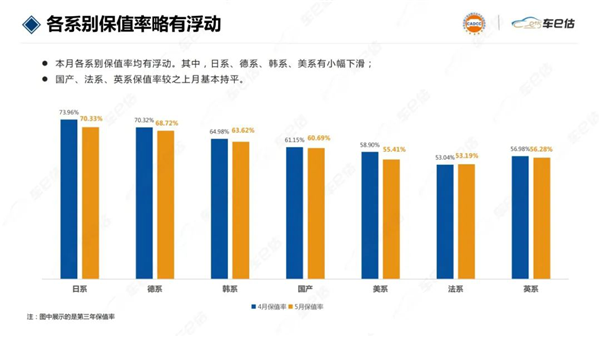從數據來看,各系別保值率均有不同程度的浮動。處于榜單上游的日系、德系、韓系浮動幅度較其他系別明顯,保值率依次為70.33%、68.72%、63.62%。此外,上月增長3%的美系,本月下滑超3%。至于國產、法系、英系這幾大系別則趨于穩定,從數據上相比,本月保值率基本與上月持平,分別為60.69%、53.19%、56.28%。