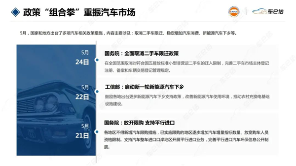 本月汽車政策重點體現在兩方面:一是穩住增量,增加新車消費;二是盤活存量,擴大二手車流通。比如國務院發布一攬子穩經濟的政策措施,其中提到穩定增加汽車消費、全面取消二手車限遷。