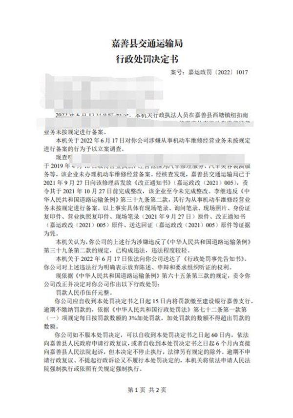 “一直想去辦,結果一直沒有去辦,是我不夠重視。”據汽車網校了解,一家名為“嘉善縣西塘鎮川流不息汽車修理店”(化名)的維修企業,因涉嫌從事機動車維修經營業務未按規定進行備案,被處罰款5000元。