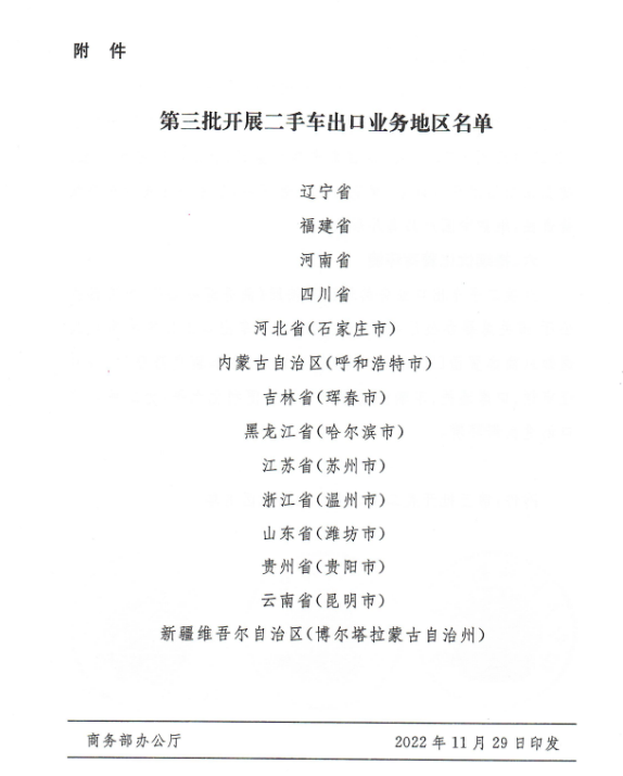 為貫徹落實國務院關于二手車出口工作的決策部署,積極有序擴大二手車出口,推動外貿保穩提質,經研究,決定新增14個地區開展二手車出口業務(名單見附件)。現將有關事項通知如下。