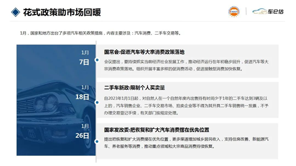 國家層面,國務院在召開例行常務會議中,提出要持續抓實當前經濟社會發展工作,促進汽車等大宗消費政策全面落地。工信部明確在2023年穩住汽車等大宗消費。國家能源局發布《新型電力系統發展藍皮書(征求意見稿)》,提出要大力推動新能源替代傳統能源車。二手車方面的新政,自2023年起,對于持有時間未滿一年的車輛,每人每年僅有前兩輛出售可到相應市場開具發票,達到三輛及以上時,各相關機構和企業不予辦理交易登記手續。