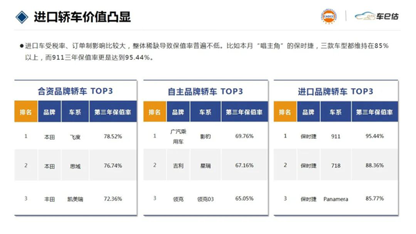 進口轎車方面,保時捷再次成為意料之中的冠軍,瓜分保值率前三位置:911、718、Panamera,三者三年保值率分別達到95.44%、88.36%、85.77%。究其原因,與其高品牌影響力、高指導價、付費選裝多、二手車數量相對稀缺有關。