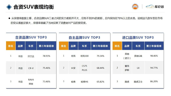 合資品牌SUV TOP3,上榜品牌與上月稍有不同。第一、第二名還是大家比較熟悉、市場熱度較高的豐田漢蘭達及本田CR-V。而本月出現的“新面孔”是來自于豐田RAV4榮放,三年保值率為73.46%。從數據上來看,三者保值率數據比較接近,僅有不到3%的差距。以上車型是較早進入中國市場的傳統強者,屬20萬左右價位中的熱門車型。時隔多年,為迎合時下主流年輕消費者的需求,都或多或少經過了幾次換代或改款,即便在當下新能源汽車的沖擊之下,它們依舊在市場保有其一席之地。
