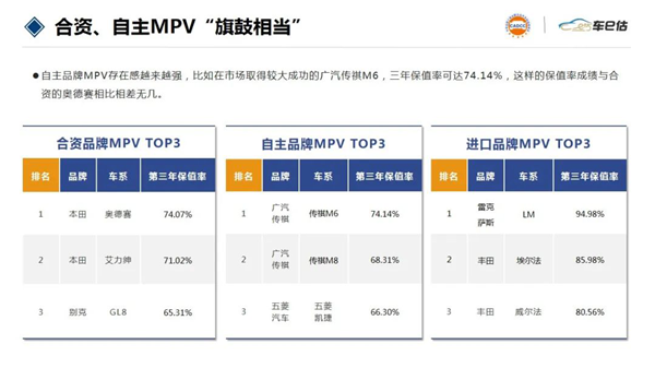 自主品牌MPV排名與上月稍有變化,保值率冠亞軍是來自廣汽傳祺的M6及M8,兩者三年保值率來到74.14%、68.31%。而上月上榜的吉利嘉際本月被五菱凱捷取代,保值率為66.30%。從榜單可發現,自主MPV的整體保值率相比合資而言毫不遜色。