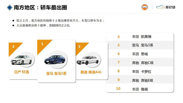 南方熱銷汽車前十,轎車最暢銷。榜單銷量前三名的品牌與上月一致,其中,寶馬5系在國內豪華車市場的地位一直都無可撼動,成為最暢銷車型。而在本月北方地區熱銷榜單僅排名第四、第六的日產軒逸及奧迪A4L,則一躍成為南方地區銷量亞季軍。上月位列第六的凱美瑞,本月排名有所提升,上升至榜單第四位,寶馬3系排名第五。榜單下游方面,日系的本田思域、豐田卡羅拉、本田雅閣上榜,排名依次為第六、第八、第十,德系的奔馳C級及奔馳E級則排名第七、第九位。