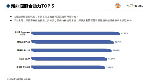 在混合動力榜單中,除了斬獲最保值車型的保時捷Panamera新能源是百萬級進口車之外,比亞迪多款在25萬以下車型緊隨其后,且占據了榜單余下4個席位。其中,比亞迪王朝系列受眾群體較為廣泛,比如介于親民與中高端定位之間的宋PLUS、秦PLUS、漢DM、唐新能源多次上榜,在各個方面也都有著不錯的表現,本月保值率依次來到88.95%、86.68%、81.98%、79.88%。總體而言,在混動車系中,比亞迪依然占據半壁江山,整體保值率表現向好。