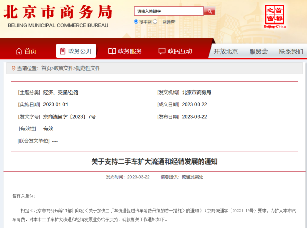 北京市商務局:關于支持二手車擴大流通和經銷發展的通知