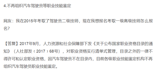 2017年9月,人力資源和社會保障部下發《關于公布國家職業資格目錄的通知》(人社部發﹝2017﹞68號),對職業資格實行清單式管理,目錄之外的一律不得許可和認定職業資格,因汽車駕駛員不在目錄內,目前各級職業技能鑒定機構不再組織汽車駕駛員職業資格鑒定。