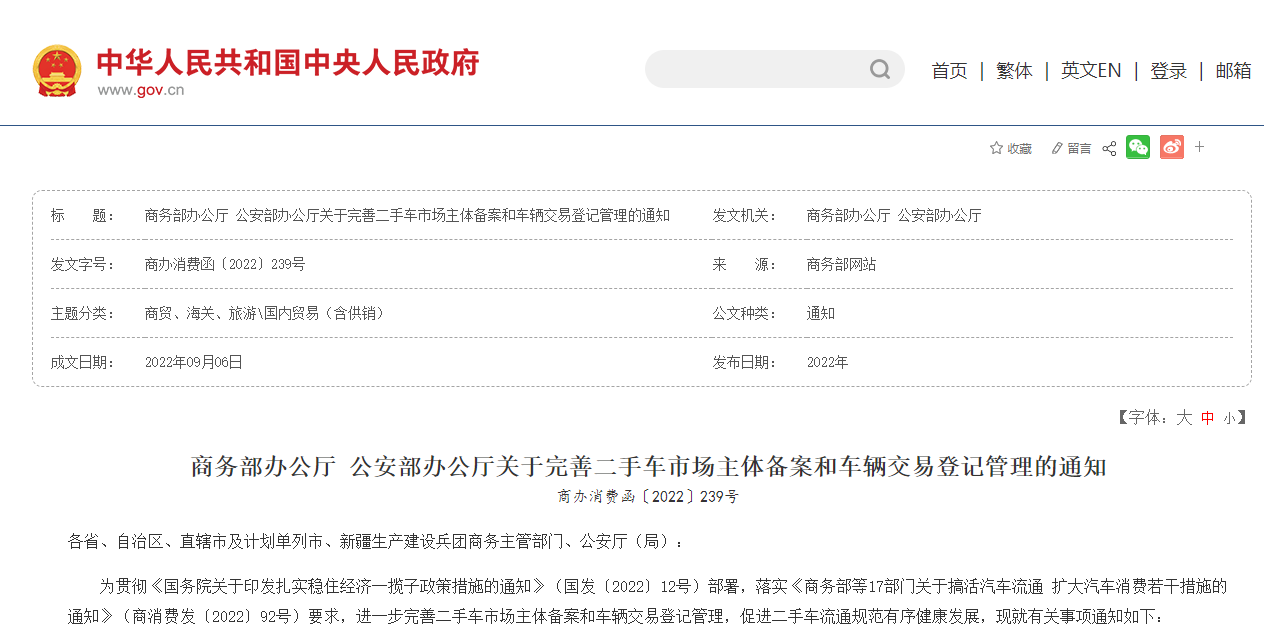 2022年5月31日,國務院《關于印發扎實穩住經濟一攬子政策措施的通知》中,第18條穩定增加汽車、家電等大宗消費,明確規定:全面取消二手車限遷政策,在全國范圍取消對符合國五排放標準小型非營運二手車的遷入限制,完善二手車市場主體登記注冊、備案和車輛交易登記管理規定。