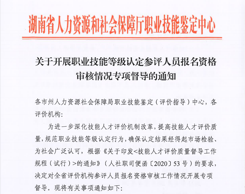 為了進一步深化技能人才評價機制改革,2023年4月,湖南省人社廳發布《關于開展職業技能等級認定參評人員報名資格審核情況專項督導的通知》,對全省各類已開展評價工作的職業技能等級認定機構(含自主評價企業、院校及社會評價機構)開展為期兩月的專項督導。