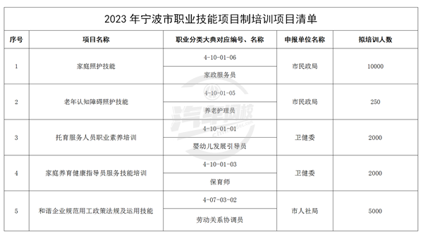 3、暫停開展一般性項目制技能培訓,但保留市委市政府重點工作相關的“一老一小”照護人員技能培訓以及新職業新工種等項目,補貼申領條件和標準仍按《寧波市人力資源和社會保障局 寧波市民政局 寧波市衛生健康委員會寧波市財政局關于印發寧波市“一老一小”照護人員職業技能培訓工作方案的通知》(甬人社發〔2022〕11號)執行。