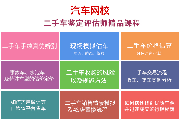 汽車網校迎合二手車行業趨勢推出二手車鑒定評估師專業精品課程,核心課程涵蓋實務理論課程、干貨實操課程、交易風險規避以及營銷實務課程。本月底二手車評估師實訓營即將開班,歡迎隨時咨詢報名!(400-007 7172)